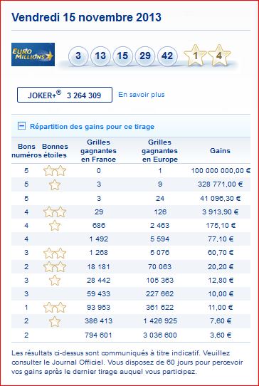 La loterie euromillions my million est la plus grande loterie en europe avec des jackpots de 17 millions d'euros allant jusqu'à 210 millions d'euros (cf. 26 millions d'euros étaient en jeu. Le résultat euromillions et les gains associés étaient plus recherchés en ce jour auréolé de superstitions sur la chance.